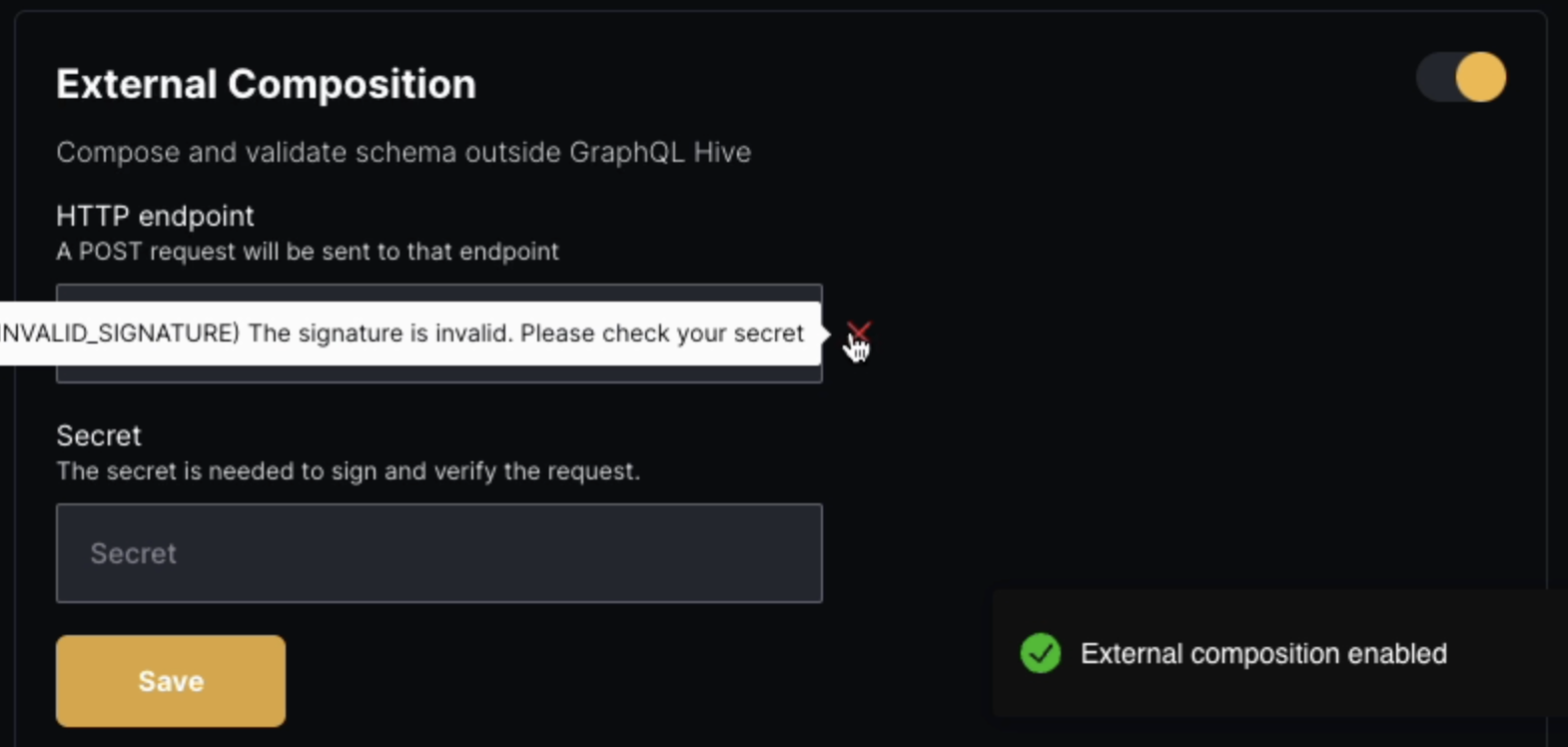 Now you should be able to use the External Composition feature in your project. Publish a GraphQL schema or perform a GraphQL schema check to validate your setup.
